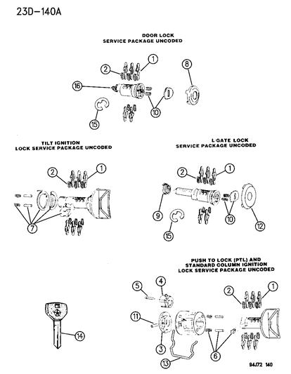MoparPartsGiant.com offers the wholesale prices for genuine 1994 Jeep Cherokee parts. Parts like Double Bitted Lock Cylinder Repair Components are shipped directly from authorized Mopar dealers and backed by the manufacturer's warranty. Parts fit for the following vehicle options. Engine: 4 Cyl 2.5L, 6 Cyl 4.0L. Transmission: 3-Speed Automatic Transmission, 4-Speed Automatic Transmission, 5-Speed Manual Transmission.