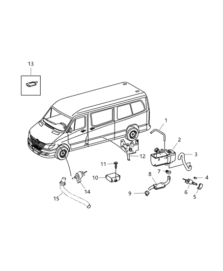 Dodge Sprinter 2500 parts. Parts like Auxiliary Warm Water Heater Mounting / Cargo & Passenger Van are shipped directly from authorized Mopar dealers and backed by the manufacturer's warranty. Parts fit for the following vehicle options. Engine: 6 Cyl 3.0L Diesel, 6 Cyl 3.5L. Transmission: 5-Speed Automatic Transmission.
